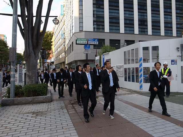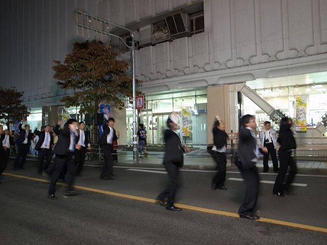 当日の踊りは17時から、出場全18団体のうち17番目の登場。山梨中央銀行や岡島が立ち並ぶ甲府のメイン・ストリートに集結した会員たちは、全員が漆黒 のスーツ姿、法被姿やチアガールが大多数を占める諸団体の中で異様にアウトレイジな存在感を放ち、心なしか皆さん我々から適度な距離を置いているように思 われます。が、気にしてはいられません。全員、踊ることで頭がいっぱいです。